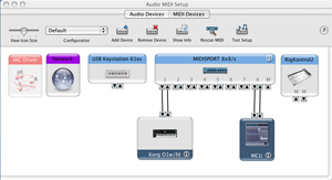 First we will look at the OS X Audio/MIDI setup program. This is located in the Applications/Utilities folder. Although Apple does provide a few stock images to associate with your devices, it would be even better if you could use an actual image of your gear. The good news is that you can. You can store a set of your own images for use by the Audio MIDI program in /Library/Audio/MIDI Devices/ I suggest you create your own folder in which to keep your images organized, but that's up to you. In the image below you can see the MIDI Page from my Audio/MIDI Setup. Note that each of the devices I keep connected to my system has its own unique icon that looks exactly like the hardware in question.