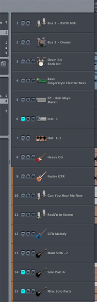 The second place that you may find images to be very useful is with in Logic itself. In the arrange window, you have the option of setting an icon for each of your tracks. Images make it very easy to identify the track quickly (especially while scrolling). As with the Audio/MIDI setup, Apple was good enough to provide a few generic Icons. If you want to take it to the next step, there is a great utility called the LogicIconizer. It is available (along with a ton of great icons) at http://www.logicprofiles.com This software will allow you to backup your existing database of icons, and add additional images that once again are more representative of your gear or track. Now if you don't want to use the Iconizer, you can always create your own images. Just keep in mind that they must be in the .png format. The size of the file image must be 128 pixels by 128 pixels. The name of the image file must begin with a three digit number. You can store them in /Library/Application Support/Logic/Logic Resources/Icons. If you look at the image to the left of this text, you will see a screen shot of one of my songs. Notice that Most tracks have a custom icon associated with them, making it very easy to spot say the Guitar tracks with out all of that dreadful reading of words.